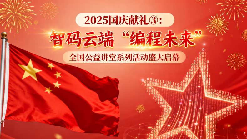 在迎接2025年国庆之际,智码云端正式启动“编程未来”全国公益讲堂系列活动,将优质编程思维教育资源无偿惠及全国青少年,通过系列化、系统化的公益课程,让每个孩子都有机会接触前沿编程知识,为国家未来科技人才培养播下思维的种子。