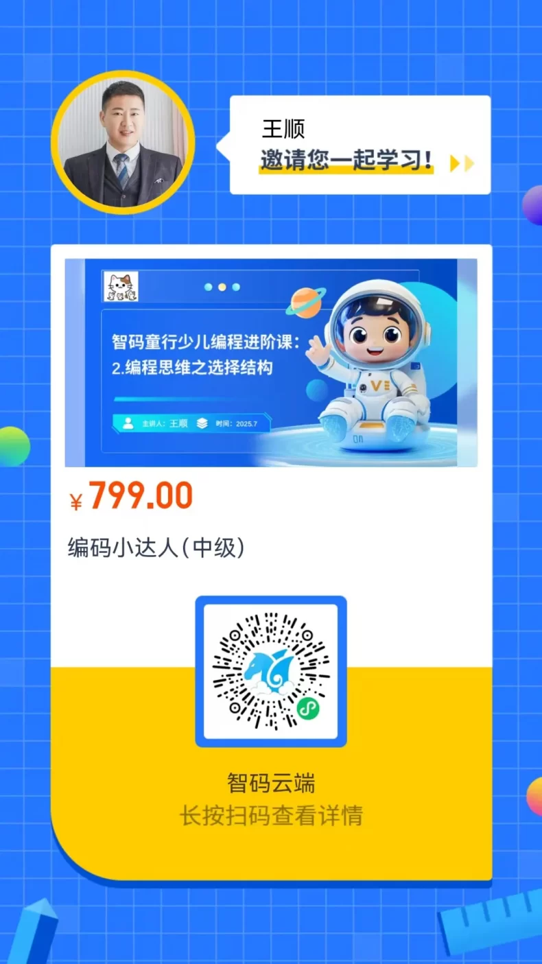 ②★平民价格贵族教育智码童行所有课程由王顺教授团队打造。王顺教授是出版20多部计算机专著顶尖专家,曾任世界500强思科资深专家、华为计算安全工程首席,在计算机领域能用“院士级视野”为孩子规划科技成长路径小学阶段编程思维培养总价为:3887元青少年阶段(含初中生、普高生、职高生、中专生、大学生、硕士、博士、公司员工、社会青年等)工程思维培养总价为:4997元