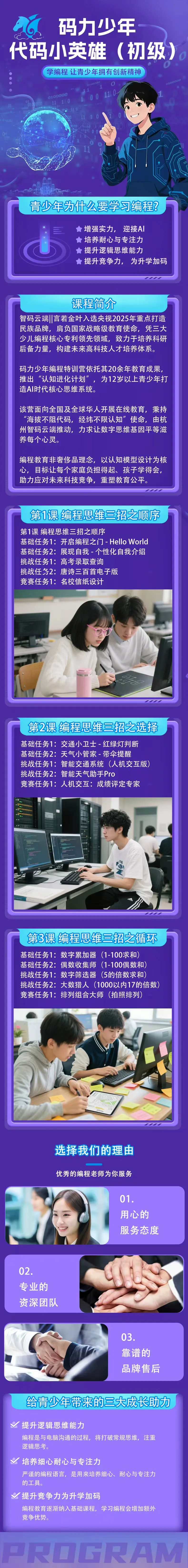 ②★平民价格贵族教育:智码童行所有课程由王顺教授团队打造。王顺教授是出版20多部计算机专著顶尖专家,曾任世界500强思科资深专家、华为计算安全工程首席,在计算机领域能用“院士级视野”为孩子规划科技成长路径。小学阶段编程思维培养总价为:3887元;青少年阶段(含初中生、普高生、职高生、中专生、大学生、硕士、博士、公司员工、社会青年等)工程思维培养总价为:4997元。