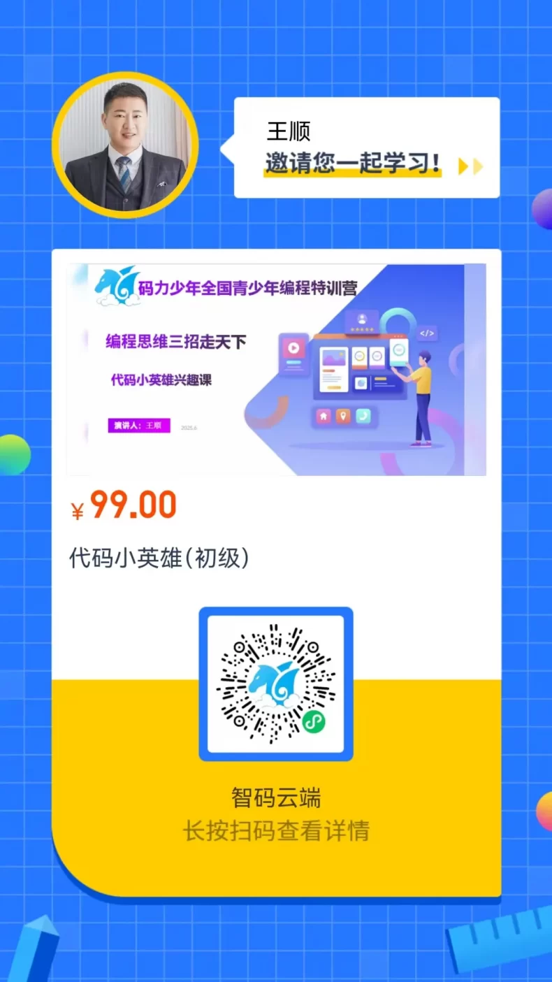 “码力少年的目标是让每一个家庭都能学得起,每个孩子都能学得会,能让孩子在未来的科技竞争中从容应对”。王顺坚信:教育的本质是赋能而非制造焦虑,技术应成为工具而非负担,正如团队信条“种一棵树,最好的时间是十年前,其次是现在”。人工智能时代下国家与社会最需要的是具有开拓与创新思想、丰富动手实践的人,而这些都可以通过编程思维培养。